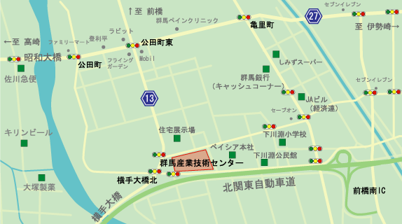 ■地下鉄、JR 電車およびバス: JR前橋駅(北口)発 永井バス 新町玉村線、 下川団地線 「産業技術センター前」バス停 JR高崎駅(東口)発 高崎市循環バス『ぐるりん』 群馬の森線(健大先回り、系統番号9)「西横手」または「宿横手団地入口」バス停 徒歩20分 JR高崎駅(東口)発 群馬バス 亀里JAビル線 「東横手」バス停 徒歩5分 車:北関東自動車道 前橋南IC より車で5分