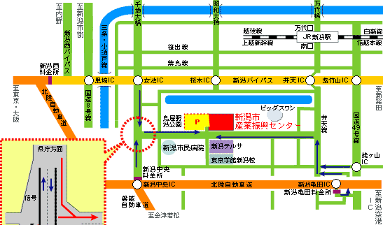 ■地下鉄、JR 電車:新潟駅 バス:新潟駅南口バスのりば (新潟市民病院・曽野木ニュータウン行き)20分 新潟市産業振興センター下車 車:・北陸・磐越自動車道新潟中央IC料金所より2分 ・新潟バイパス女池ICより5分