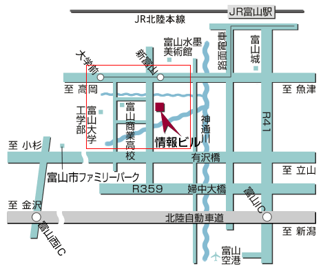 ■お車での来場が可能です JR富山駅より約5分/富山空港より約15分 北陸自動車道:富山インターより約20分/ 富山西インターより約15分 ■地下鉄、JR、バス >市電の場合 富山駅前より富山大学前行乗車12分、新富山下車、徒歩15分 >バスの場合 JR富山駅より小杉高岡方面乗車10分、新富山下車、徒歩15分