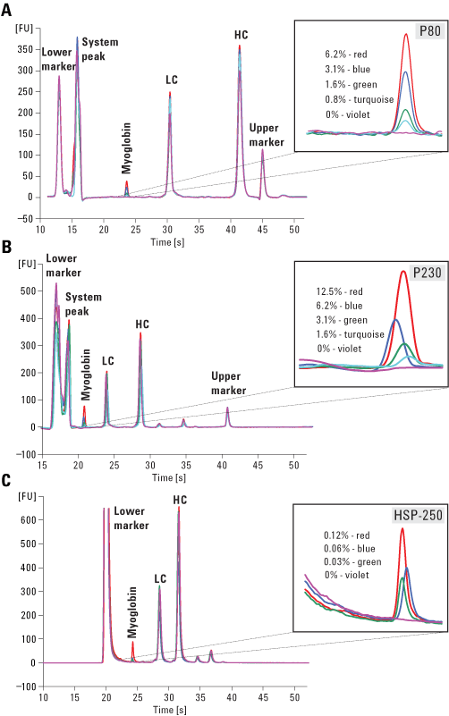3 つのキットすべてが、サンプルにスパイクしたミオグロビン不純物を検出しています。また、HSP-250 キットが最も低い検出下限を示しています。