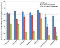 最適化された Agilent Bond Elut EMR-Lipid メソッドと、C18/PSA 分散SPE およびジルコニア系吸着剤によるクリーンアップを用いた従来の QuEChERS メソッドを比較しました。図 1 は、ウシ肝臓から抽出した動物用医薬品のうち、脂質の影響を受ける特定成分を比較したものです。最適化された EMR-Lipid プロトコルでは、特にジルコニア系吸着剤を用いたメソッドに比べ、脂質の影響を受ける分析対象物の回収率と精度が格段に向上しています。EMR-Lipid を使用した場合、ほぼすべて (93 %) の分析対象物の回収率が 70~120 % でした。これに対し、従来の QuEChERS プロトコルとジルコニアプロトコルで 70~120 % の回収率が得られたのは、分析対象物のそれぞれ 80 % と 55 % に留まりました。特に、ジルコニアを用いたメソッドでは、フルオロキノロン類およびテトラサイクリン類に対して低い回収率が示されました。このように、Agilent Bond Elut EMR-Lipid では、C18 による 分散SPE およびジルコニアを用いたメソッドより格段に優れた結果が得られました。