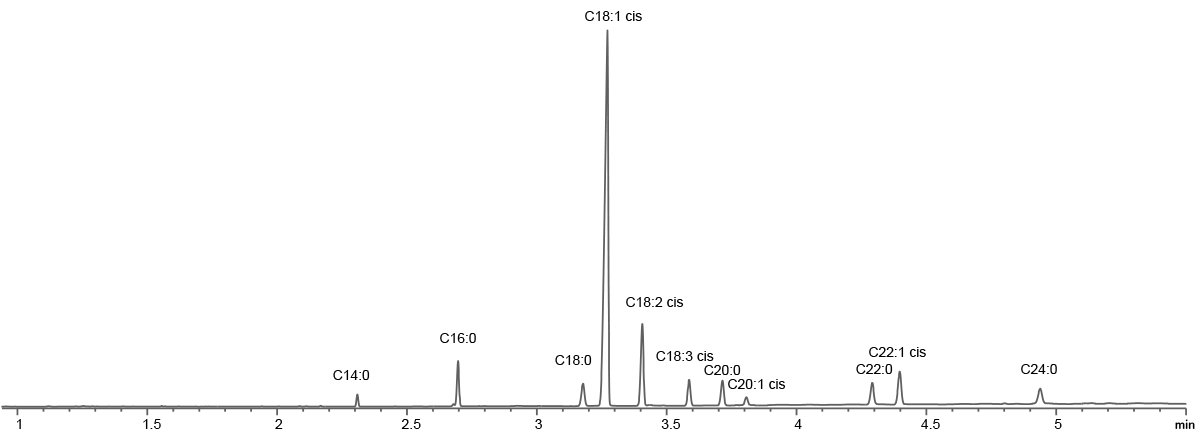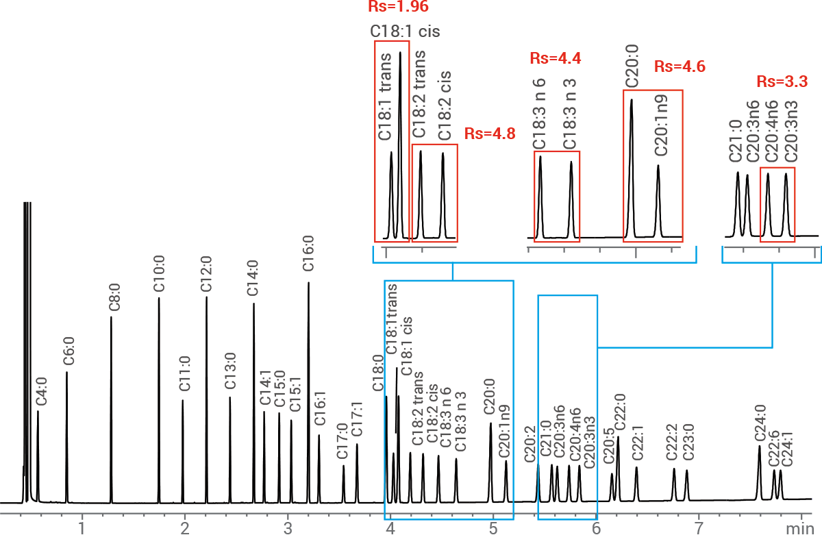 これらの革新的なカラムにより、従来の FAME 混合物を 8 分未満で分離できます。例えば、乳脂、植物油、魚油 (DPA、EPA など) 中の C18:1 および C18:2 シストランス異性体や FAME の高速分離が可能です。また、次のような特長もあります。