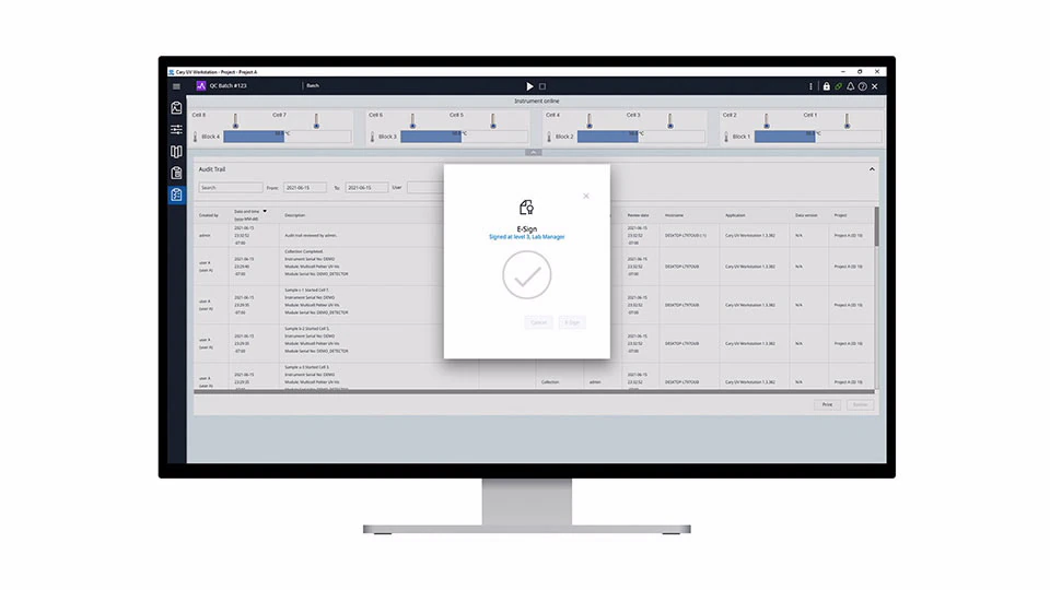 Cary 3500 マルチゾーンソフトウェアには、4 つの独立した温度ゾーンを管理できるアドオンが含まれています。Cary 温度プローブと組み合わせて、キュベット内から温度を制御できます。Agilent OpenLab ソフトウェアと連携するように設定した場合、Cary UV ワークステーションのデータをローカルまたは中央のデータベースで管理・保護し、安全に保管できます。