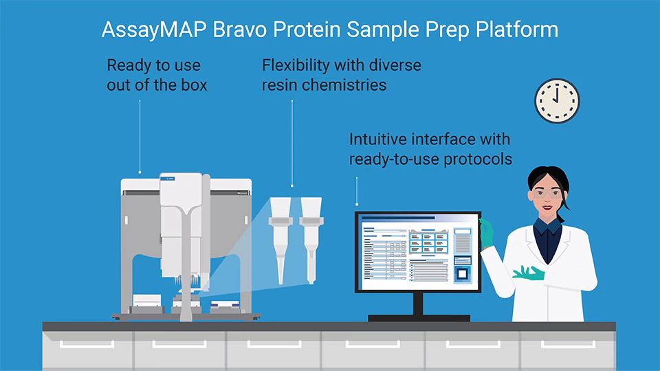 AssayMAP Bravo Platform は、高精度の流量コントロール、多様な樹脂充填剤のマイクロクロマトグラフィーカートリッジ、直感的なソフトウェアが組み合わせることで、クロマトグラフィーの性能をサンプル前処理に活用することができます。プロテオミクスや生物製剤の創薬・開発で用いられる多様なタンパク質サンプル前処理ワークフローに対応できるよう、特別に設計されたシステムです。
