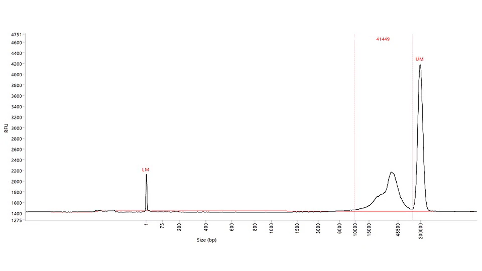 Large Fragment Kit はロングリードの NGS ライブラリおよび DNA フラグメントやスメアを正確に分析します。HS Extended Large Fragment DNA Ladder には 48.5 kb のフラグメントが含まれており、50 kb までのサイジングができます。