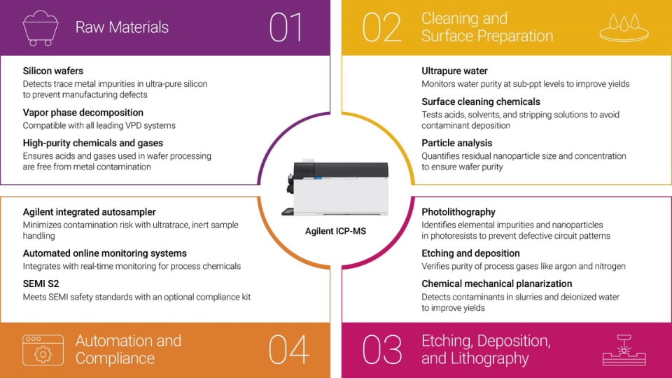 このインフォグラフィックは、半導体製造における 4 つの重要なプロセスで、ICP-MS がどのように超高純度分析を実現しているのかを紹介しています。