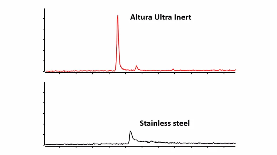 その結果、Altura カラムでは固定相本来の分離能力を最大限に活用でき、金属と相互作用を示すような非常に分析が困難な分析対象でも、優れたクロマトグラフィー性能、平衡化時間の短縮、感度の向上を実現できます。